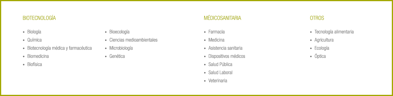 Biólogos, Químicos, Bioquímicos, Físicos, Médicos, Farmacéuticos, licenciados en Biotecnología, licenciados en Ciencias Ambientales, Ingenieros Agrícolas, Ingenieros de Biosistemas, Ingenieros Biomédicos e Ingenieros de Procesos.