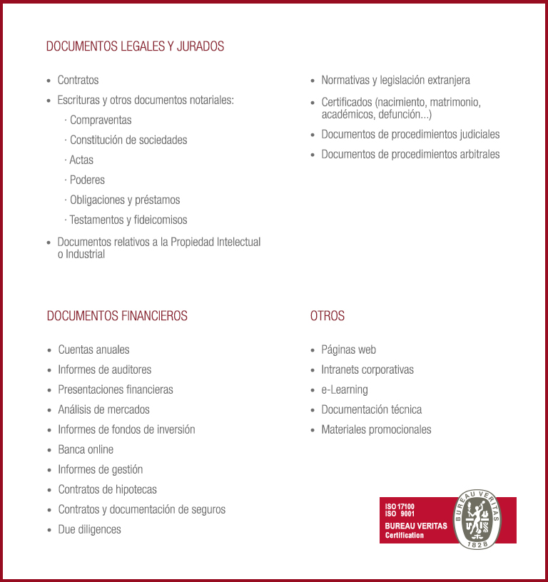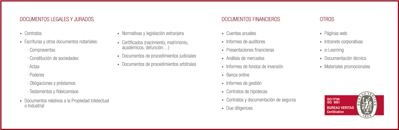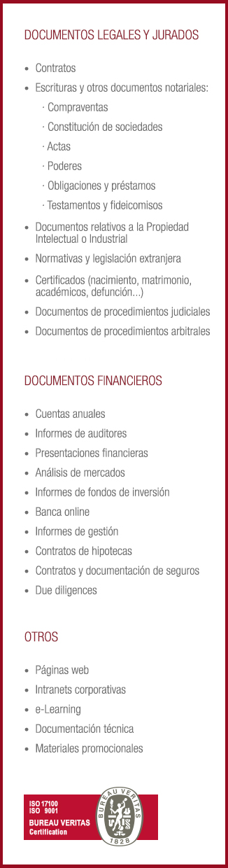 En la traducción de documentos legales y financieros, cada palabra debe ajustarse exactamente a lo que se desea expresar en el documento original, no sólo en lo referido a la exactitud del término empleado, sino también en el alcance que cada palabra tiene en cada idioma, de forma que el receptor del documento disponga exactamente de la misma información que proporciona el documento a traducir. Desde nuestros inicios hemos creído que las personas más adecuadas para realizar una traducción jurídica y económica son aquellas que disponen de una formación específica o presentan una experiencia profesional sobre el campo en el ámbito de cada uno de los textos. Seleccionar cuidadosamente a nuestros traductores y utilizar las herramientas más avanzadas de control y gestión de los procesos nos permite proporcionar a nuestros clientes traducciones de la máxima calidad y eficiencia en los plazos solicitados.