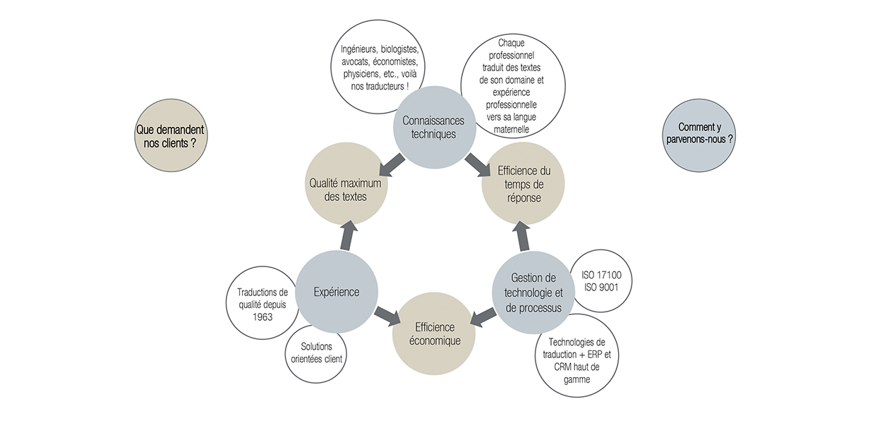 L’utilisation correcte de la technologie dans le secteur de la traduction permet d’améliorer la qualité et l’homogénéité des textes (utilisation de glossaires, de mémoires de traduction, de listes de termes interdits, etc.) et une amélioration continue de l’efficacité sur le plan des coûts. De même, un contrôle de processus conforme aux norme européenne ISO 17100, uni à des systèmes de gestion avancés (ERPs et CRMs), permet la traçabilité de tous les projets et un contrôle de coûts à un niveau individuel et regroupé pour les départements Achats de nos clients.